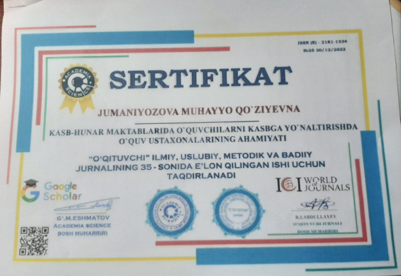 Yangibozor tuman 2-son kasb-hunar maktabi bosh ustasi Jumaniyozova Muhayyo Qo'ziyevna tomonidan "O'QITUVCHI" ilmiy, uslubiy, metodik va badiiy jurnalida "Kasb-hunar maktablarida o'quvchilarni kasbga yo'naltirishda o'quv ustaxonalarining ahamiyati" mavzusida maqolasi nashr qilindi