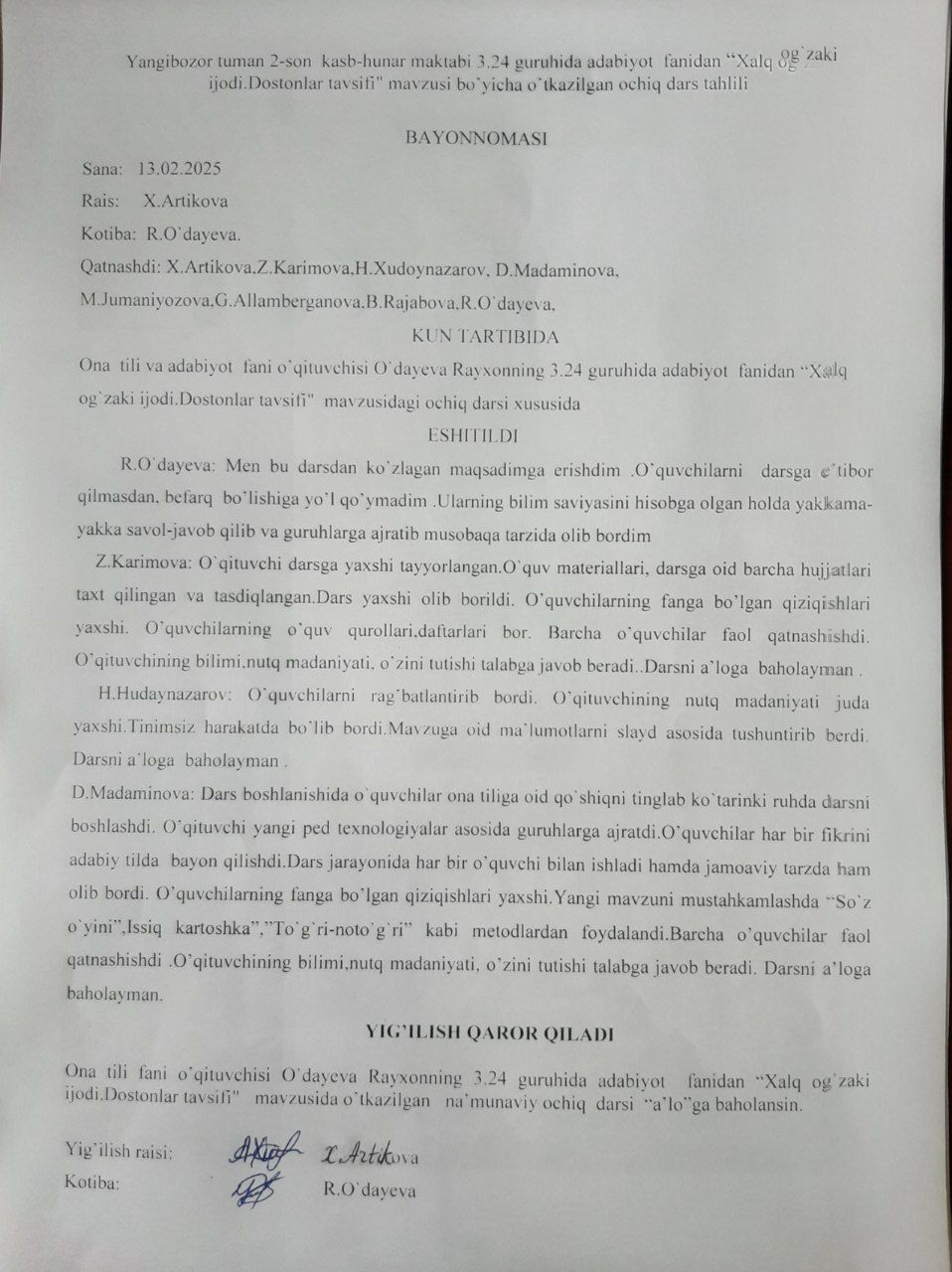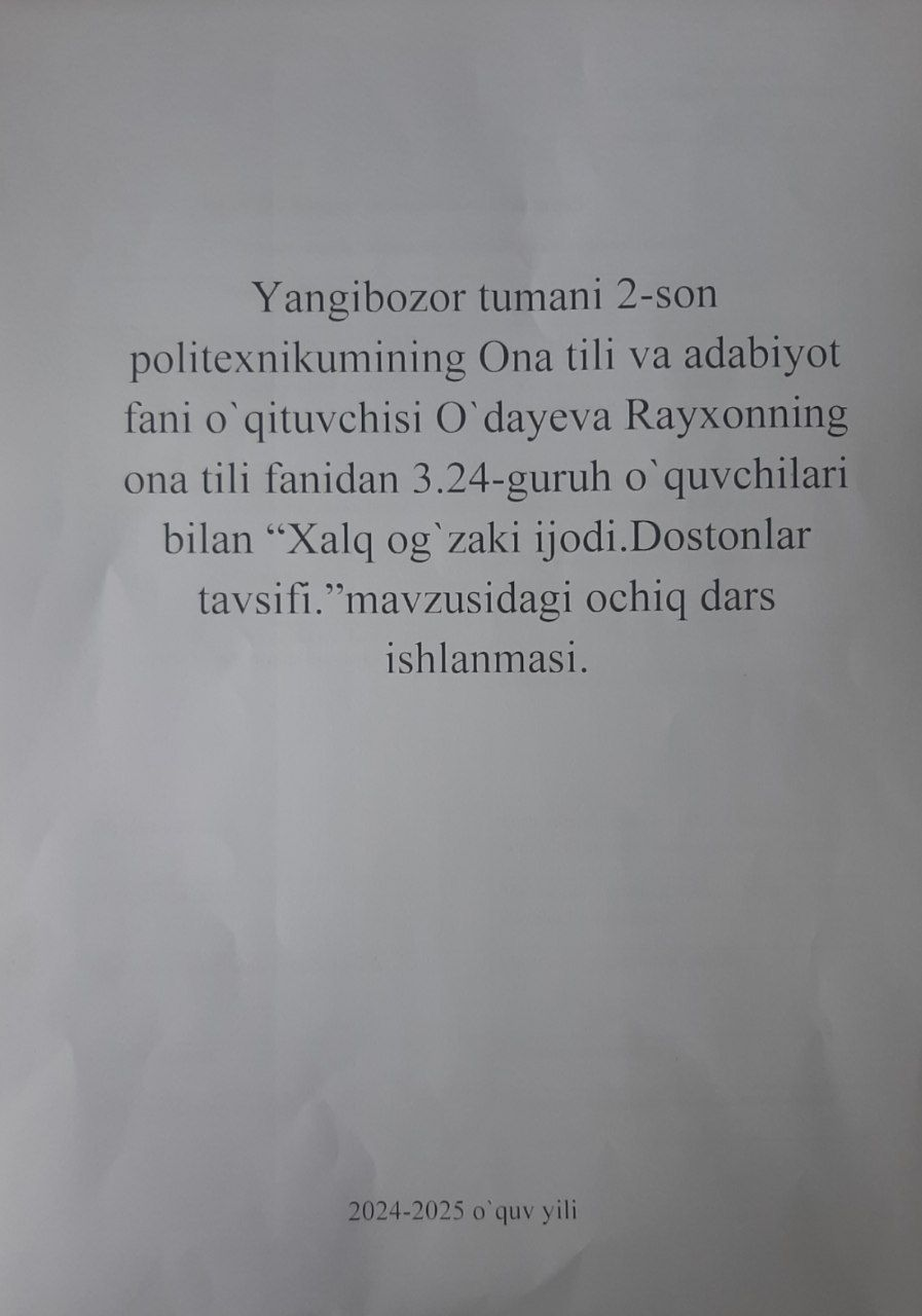 Yangibozor tuman 2-son politexnikumida 13-fevral kuni 3.24 guruhida adabiyot fanidan "Xalq og'zaki ijodi.Dostonlar tavsifi"mavzusida ona tili va adabiyot fani o'qituvchisi O'dayeva Rayxon tomonidan ochiq dars tashkil qilindi.Ochiq dars qiziqarli va jonli tarzda olib borildi.Yangi metodlardan unumli foydalanildi.